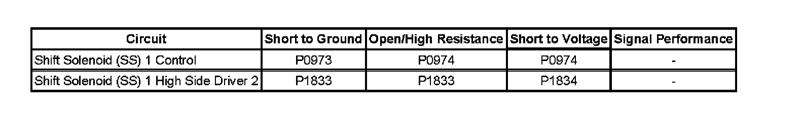 - Shift Solenoid (SS) 1 Control Circuit Low Voltage