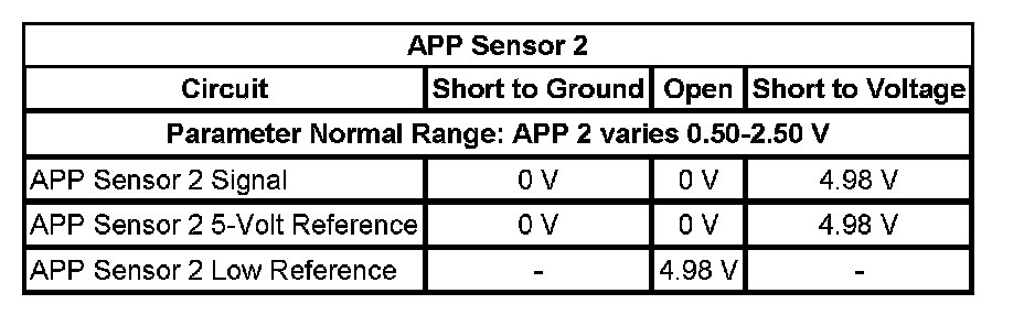 - Accelerator Pedal Position (APP) Sensor 2 Circuit Low Voltage