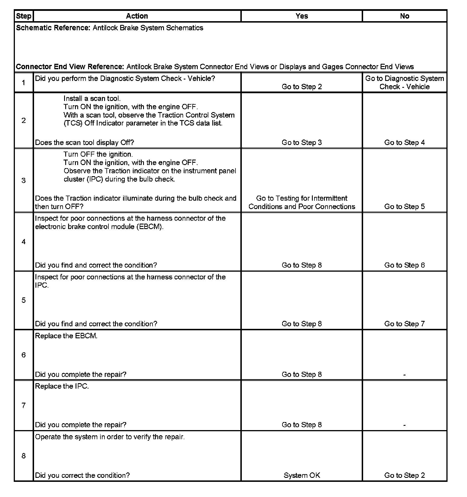The traction control indicator is controlled by the instrument panel cluster (IPC) via serial data messages from the electronic brake control module (EBCM). The EBCM send a serial data message to the IPC to illuminate the traction control indicator when the EBCM has disabled traction control system (TCS) due to a DTC. The traction control indicator will also turn ON during the instrument cluster bulb check. When the ignition switch is turned to ON, the traction control indicator will turn ON for approximately 3 seconds and then turn OFF.