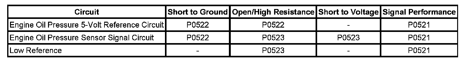 The engine oil pressure (EOP) sensor changes voltage based on the engine oil pressure. The EOP sensor is a 3-wire sensor comprising of the signal circuit, the low reference circuit and the 5-volt reference circuit. The engine control module (ECM) or the powertrain control module (PCM) supplies 5-volts to the EOP sensor via the 5-volt reference circuit and provides ground via the EOP low reference circuit. The ECM/PCM monitors the signal circuit of the EOP sensor to determine the engine oil pressure sensor voltage is within the normal operating range of approximately 1-4 volts. When the engine oil pressure is high, the EOP sensor voltage is high and the ECM/PCM senses a high signal voltage. When the engine oil pressure is low, the EOP sensor voltage is low and the ECM/PCM senses a low signal voltage. The ECM/PCM sends the EOP information to the instrument panel cluster (IPC) via GMLAN serial data message.