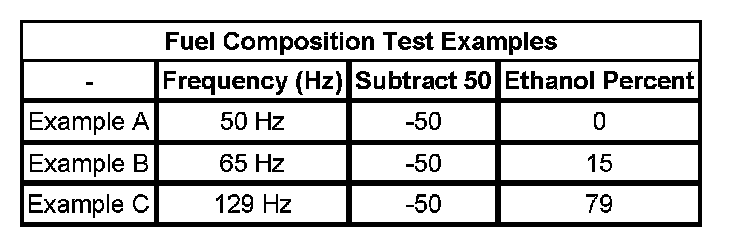 2. Subtract 50 from the reading on the DMM in order to obtain the percentage of alcohol in the fuel sample. Refer to the examples in the Fuel Composition Test Examples table.