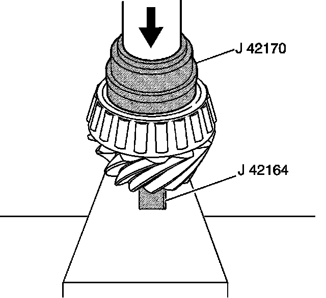 1. Install the bearing onto the pinion shaft using the J 42170 (1), J 42164 (2) or DT-48007 (2), and a hydraulic press.