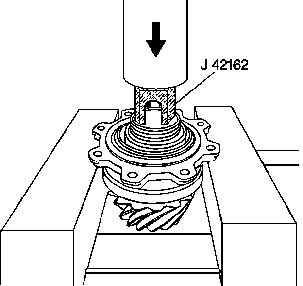 3. Use the J 42162 and a hydraulic press in order to remove the pinion shaft and bearing from the housing/cage.