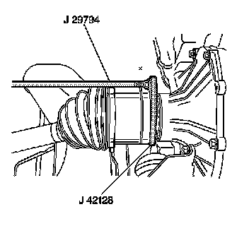 21. Install the J 42128 evenly onto the rear beveled surface of the drive shaft inner joint housing.