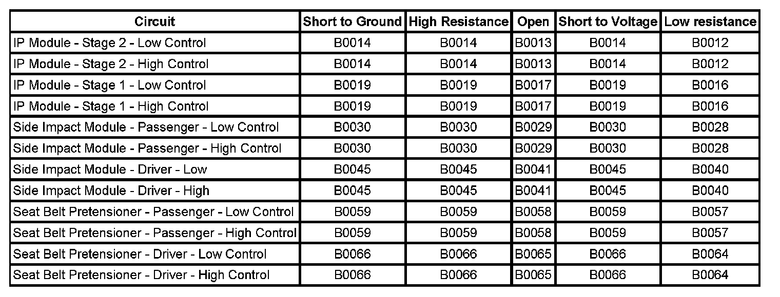 * The airbag module stage 1 or stage 2 high and/or low circuits is short to ground or short to voltage for 500 milliseconds.