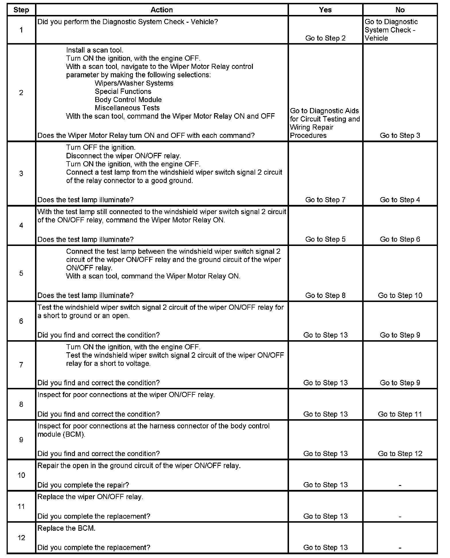 5. This step tests for an open in the ground circuit of the wiper ON/OFF relay.