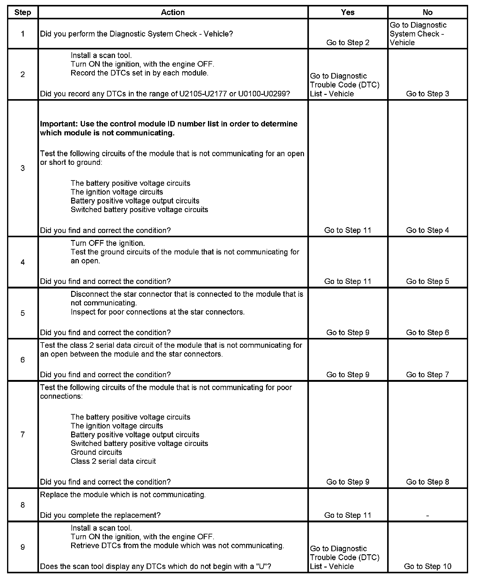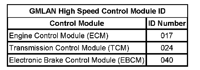 The control module ID number list below provides a method for determining which module is not communicating. A module with a class 2 serial data circuit malfunction or which loses power during the current ignition cycle will have a Loss of Communication DTC set by other modules that depend on information from that failed module. The modules that can communicate will set a DTC indicating the module that can not communicate. The following modules communicate on class 2 serial data circuit: