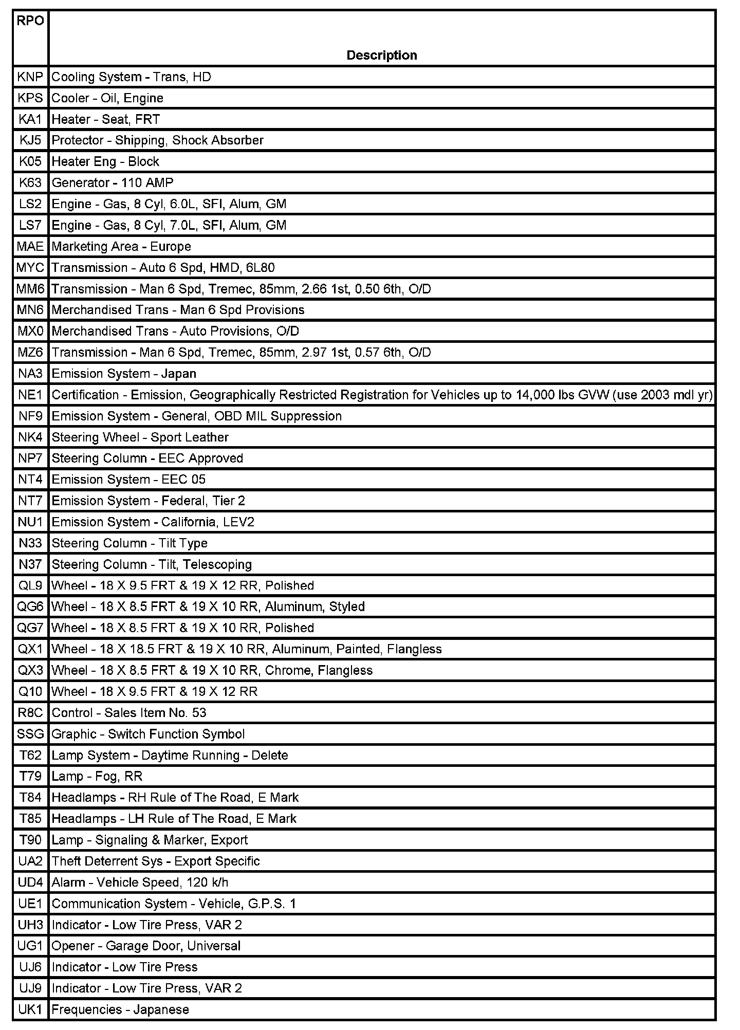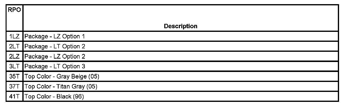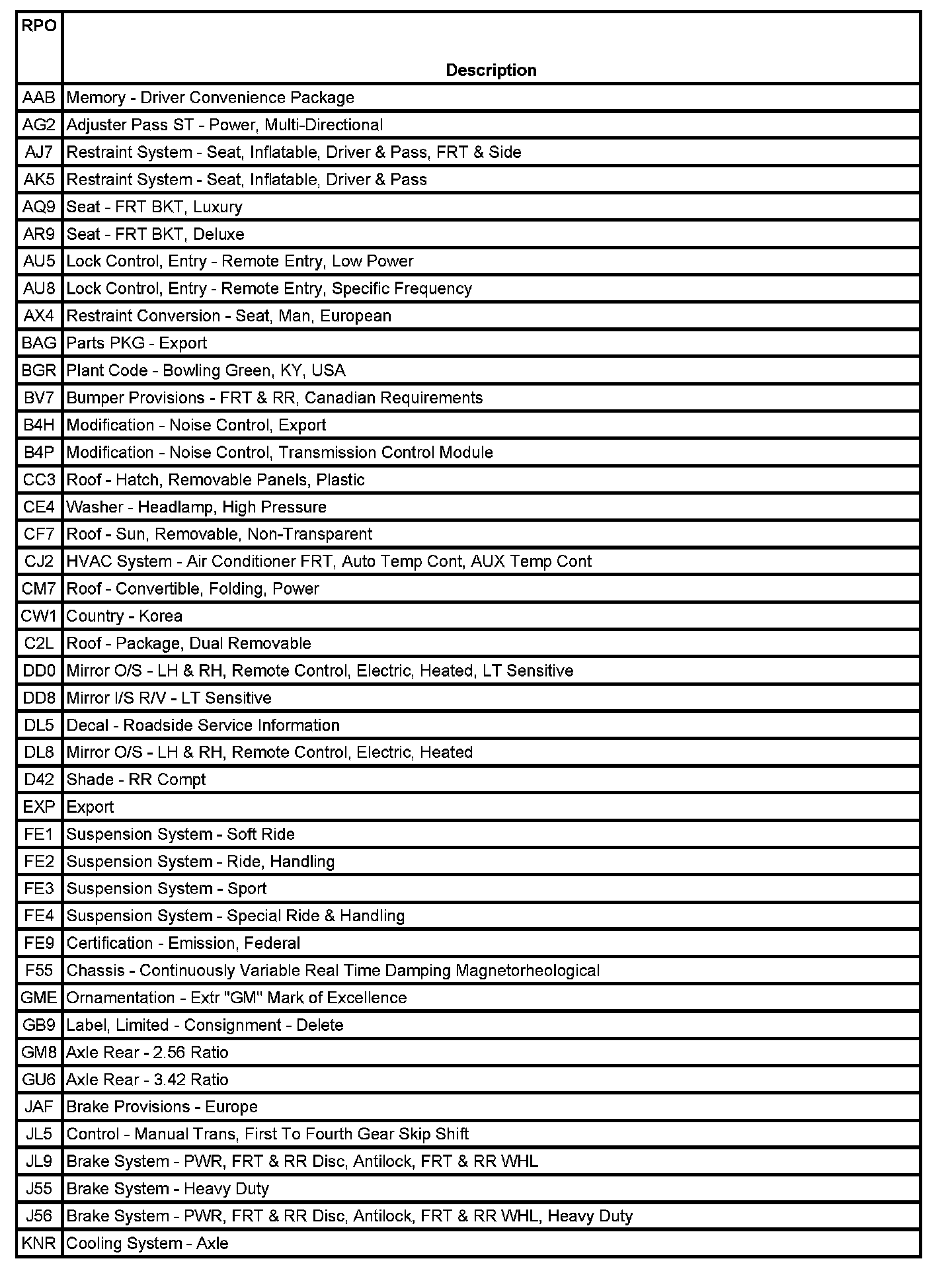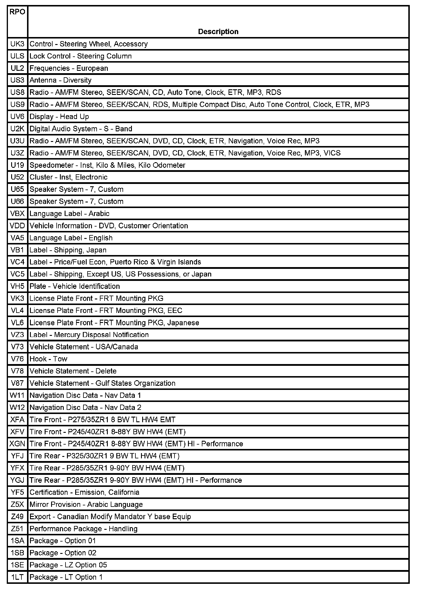 The following table provides the description of the Regular Production Option (RPO) codes that are available on the vehicle. The vehicle's RPO list is printed on the Service Parts Identification Label.