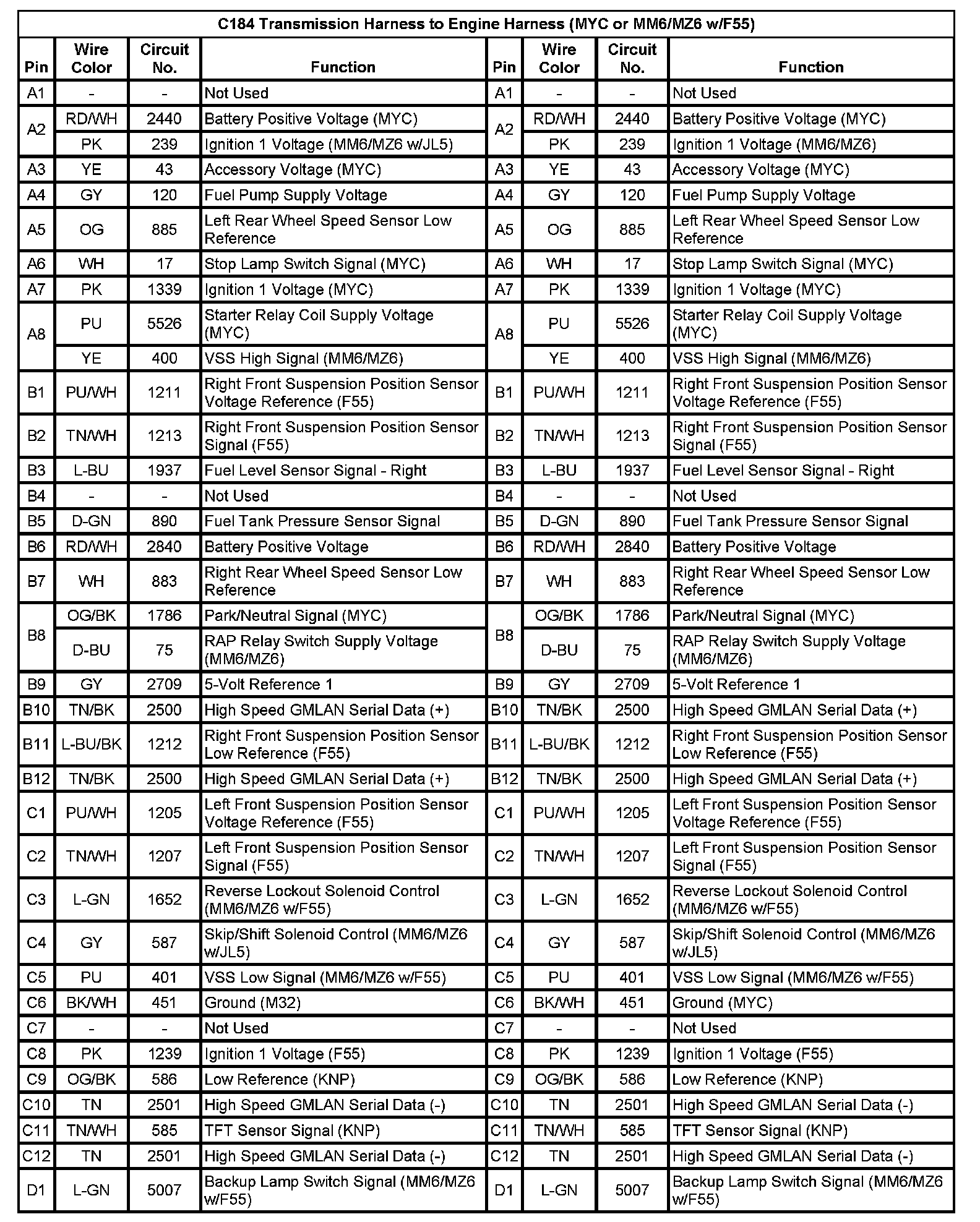 C184 Transmission Harness to Engine Harness (MYC or MM6/MZ6 w/F55) (Pin A1 To D1):
