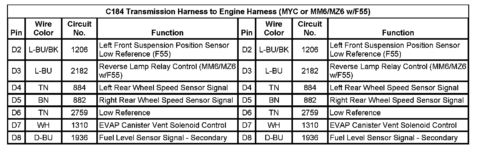 C184 Transmission Harness to Engine Harness (MYC or MM6/MZ6 w/F55) (Pin D2 To D8):