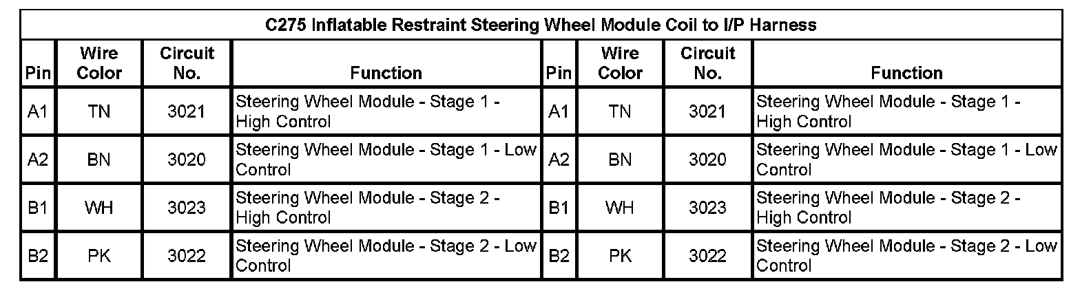 C275 Inflatable Restraint Steering Wheel Module Coil to I/P Harness