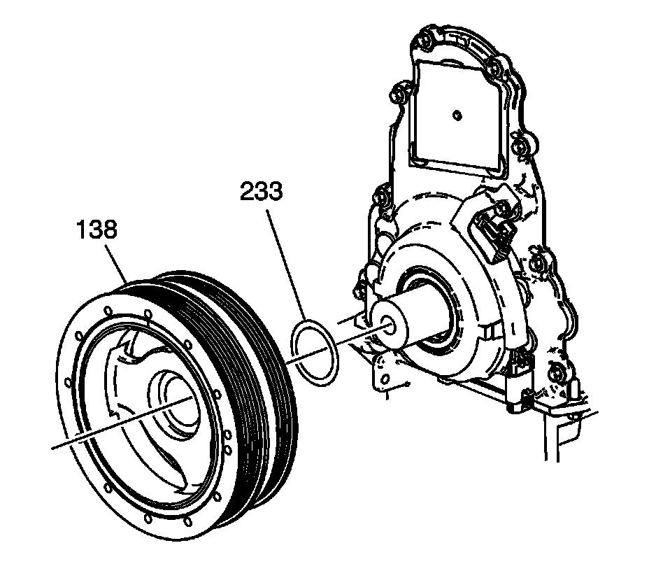* For manual transmission applications, note the position of the crankshaft balancer before removal. The balancer does not use a key or keyway for positioning. Mark or scribe the end of the crankshaft and the balancer before component removal. The crankshaft balancer must be installed to the original position. If replacing the crankshaft balancer, note the location of any existing balance weights, if applicable. Crankshaft balance weights must be installed into the new balancer in the same location as the old balancer. A properly installed balance weight will be either flush or below flush with the face of the balancer.