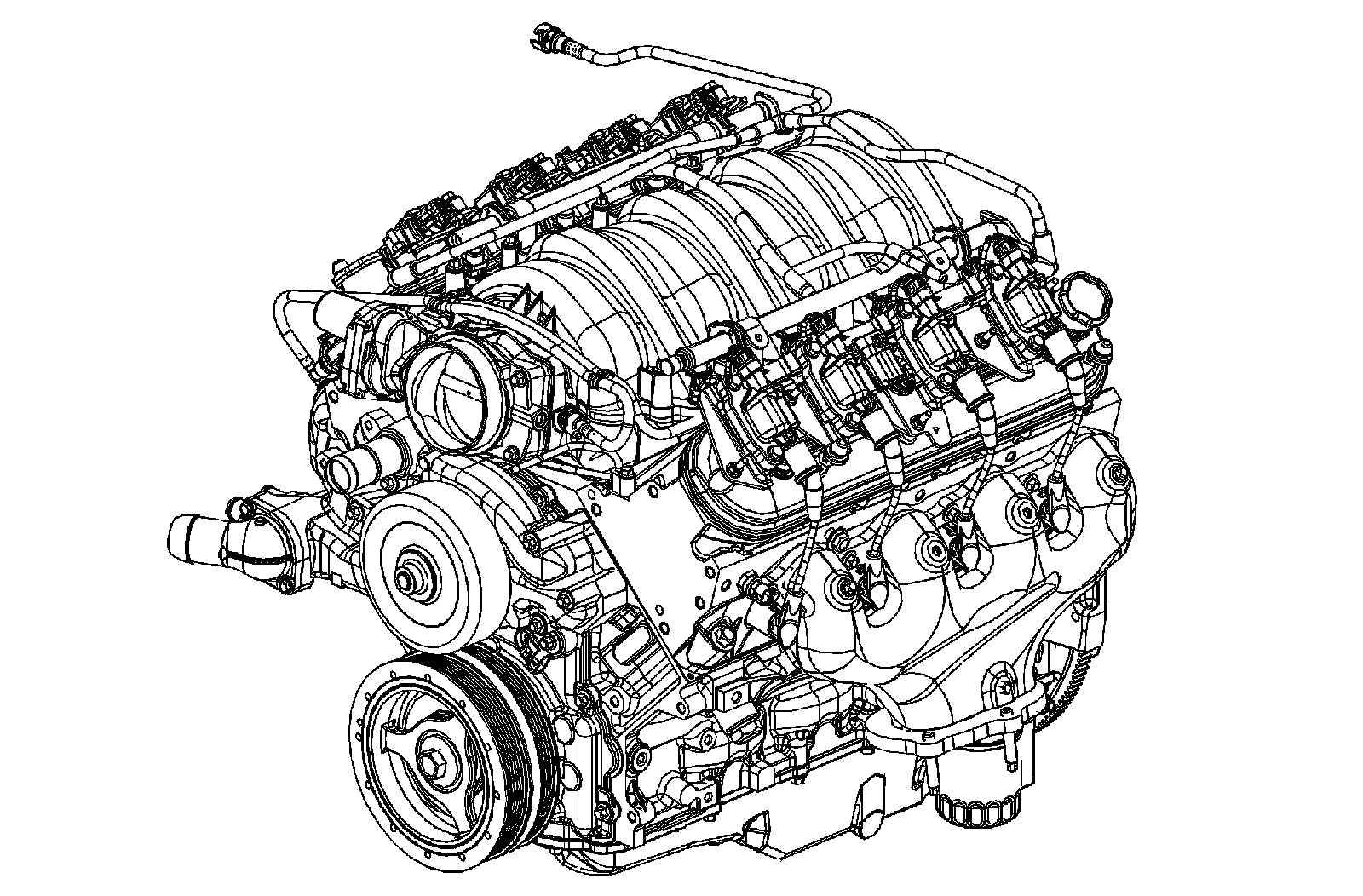 The intake manifold is a friction welded 3 piece composite design that incorporates brass threaded inserts for mounting the fuel rail, throttle body, and wire harness studs. Each side of the intake manifold is sealed to the cylinder head by 4 non-reusable push-in-place silicone sealing gaskets. The 90 mm (3.54 in) electronically actuated throttle body bolts to the front of the intake manifold. The throttle body is sealed by a 1 piece push-in-place silicone gasket. The fuel rail assembly, with 8 separate fuel injectors, is retained to the intake by 4 bolts. The injectors are seated into their individual manifold bores with O-ring seals to provide sealing. 2 fuel rail stop brackets are retained to the rear of the intake manifold by mounting bolts. The manifold absolute pressure (MAP) sensor is installed and retained to the top front of the intake manifold and sealed by an O-ring seal. The evaporative (EVAP) emission canister purge solenoid valve is mounted to the front of the right cylinder head. There are no coolant passages within the intake manifold.