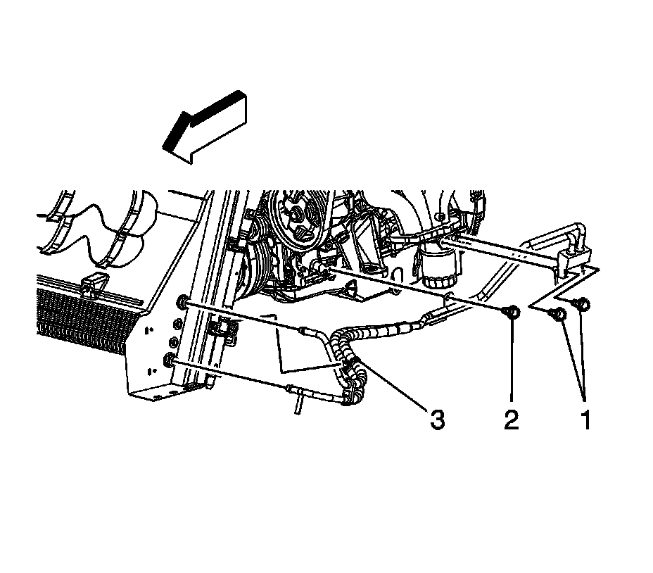 7. Install the engine oil cooler hose/pipe clip (3) to the fan shroud.