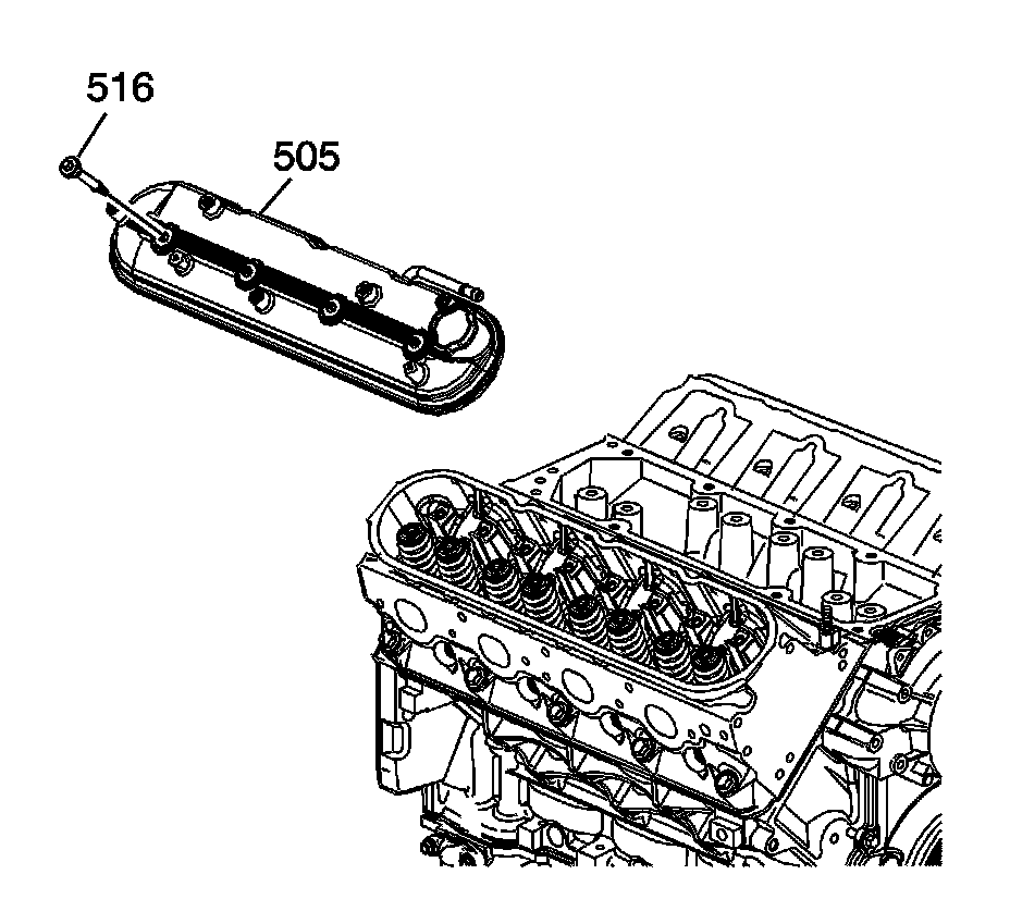 6. Remove the valve rocker arm cover bolts (516) and cover (505).