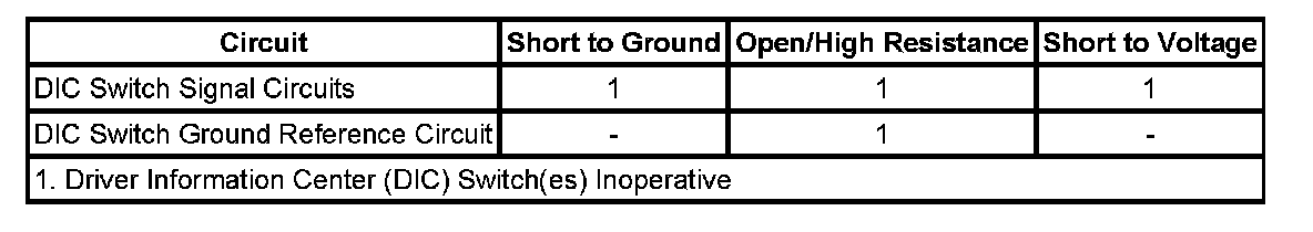 • If all DIC switch parameters are not Inactive, test the suspect switch signal circuit for a short to ground. If the circuit tests normal, replace the instrument panel cluster (IPC).