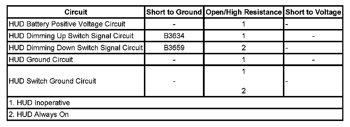 • If the test light does not illuminate, test the HUD dimming up switch signal circuit and the ground circuit for an open/high resistance. If the circuits test normal, replace the HUD switch.