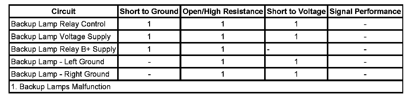 • If the backup lamps do not activate, test the relay controlled output circuit for an open/high resistance. If the circuit tests normal, test or replace the inoperative backup lamp.