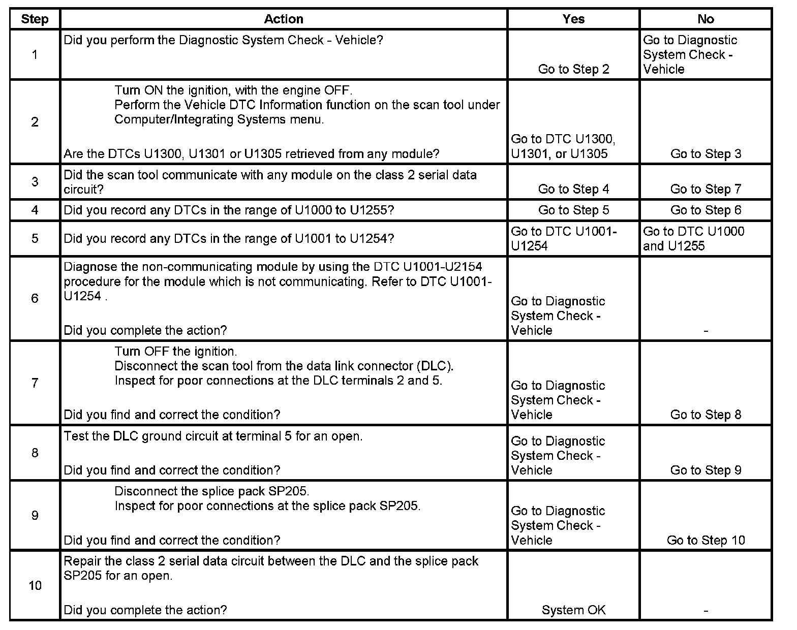 10. An open in the class 2 serial data circuit between the DLC and splice pack SP205 will prevent the scan tool from communicating with any module on the class 2 network. This condition will not set a DTC.