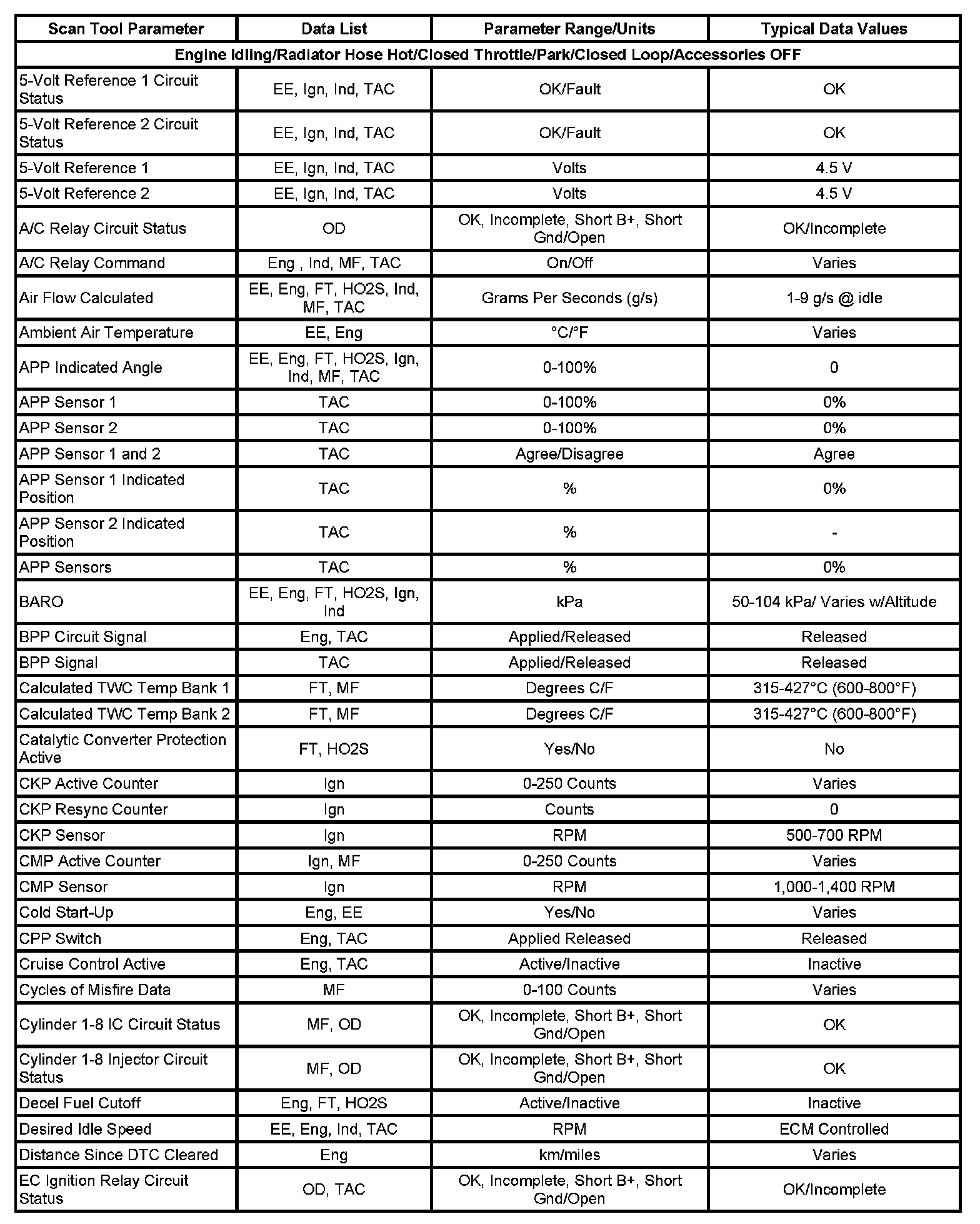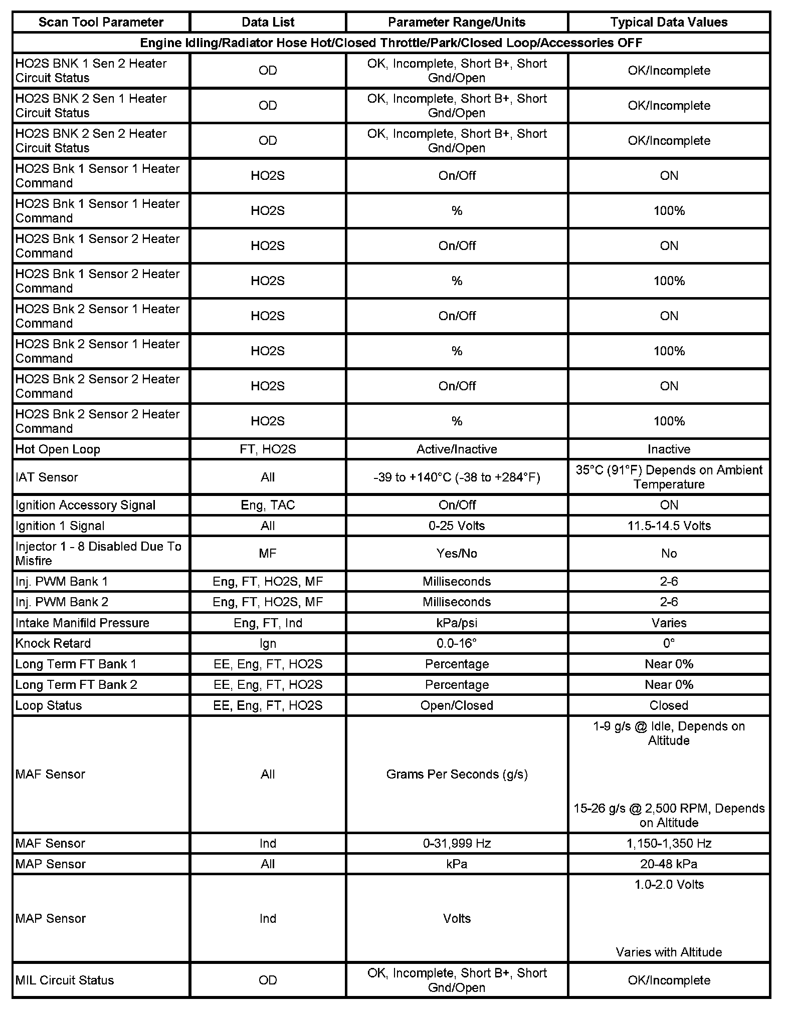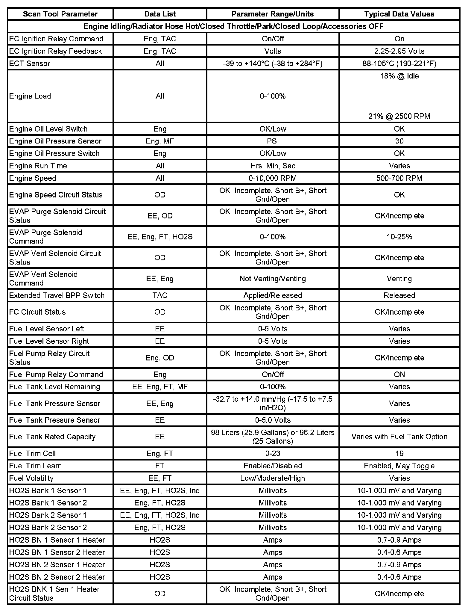 The Engine Scan Tool Data List contains all engine related parameters that are available on the scan tool. The list is arranged in alphabetical order. A given parameter may appear in any one of the data lists, and in some cases may appear more than once, or in more than one data list in order to group certain related parameters together.