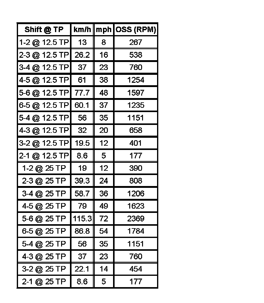 Important: Shift speed points are affected by many different vehicle and transmission operating conditions. The table above represents shift speed points calibrated at specific throttle angles during normal operating conditions and a temperature range between 0-130°C (32-266°F). These shift speed points are also based on an axle ratio of 2.56, and assume a production-intent tire size. The table below illustrates a number of different variables that influence these shift speed points. Based on a given operating condition, these variables may override the normal shift speed points. To assist in monitoring the different variables, the respective scan tool data parameter is also listed.