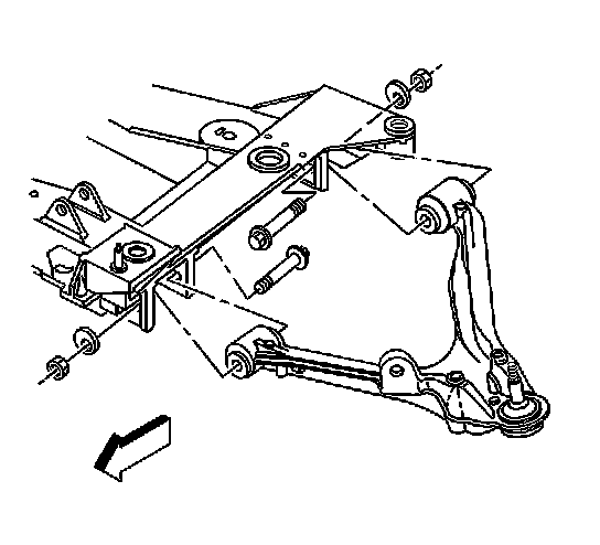 13. Remove the cam bolts, washers, and nuts retaining the control arm to the crossmember.