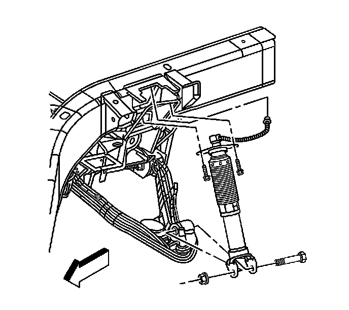 Notice: Do not remove the transverse leaf spring compressor tool until after the shock absorber has been installed. The pad on the transverse leaf spring bolt could move out of position resulting in damage to the pad or a rattle in the suspension.
