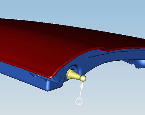 3. Apply a coating of dielectric silicone grease, GM P/N 12345579 (In Canada, P/N 10953481) to the rear locating pins (1) on the roof panel AND the rear locators on the roof bow. This will help to insulate the pins and prevent noise from radiating through the roof panel.