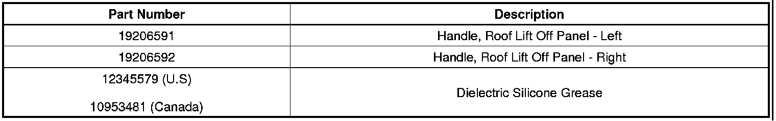 For any latch handle replacement, use only P/N 19206591 (left) and P/N 19206592 (right). These current handles have a revised roller that was redesigned so it does not roll, but now slides across the latch receiver. All 2009-2012 removable roofs (painted and transparent) have the new handle design. Handles should not be changed for vehicles built after the beginning of production for the 2009 model year.