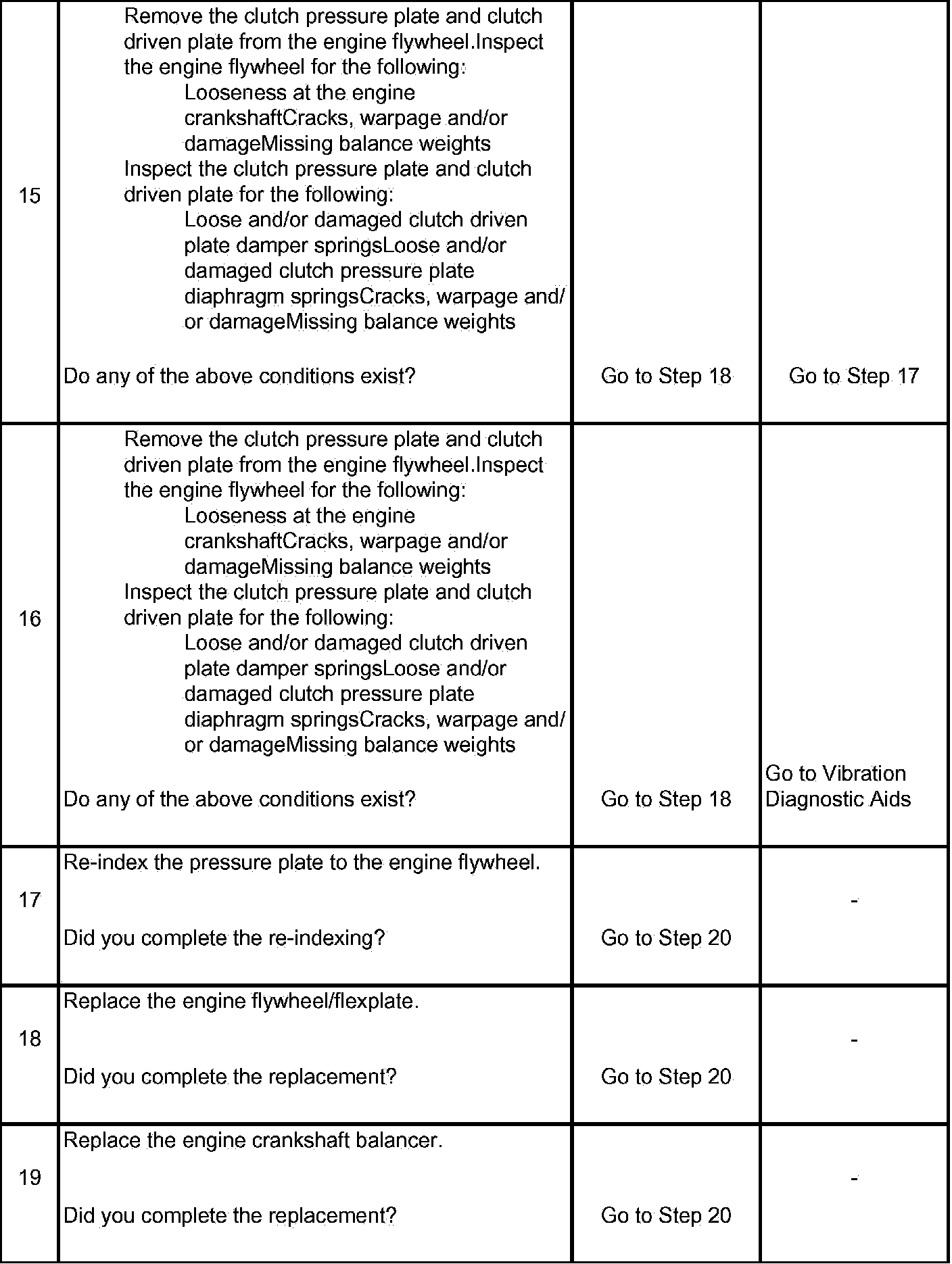 15. An engine flywheel that is loose at the engine crankshaft or that is cracked, damaged and/or missing balance weights; and/or a clutch pressure plate and clutch driven plate that has loose springs, cracks, warpage, damage and/or missing balance weights - can produce a disturbance when their mass is combined.