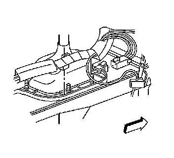 4. Position a large pry bar along the side of the driveline support assembly and use as an aid to secure the shift control cable end clip to the floor shift control arm stud.