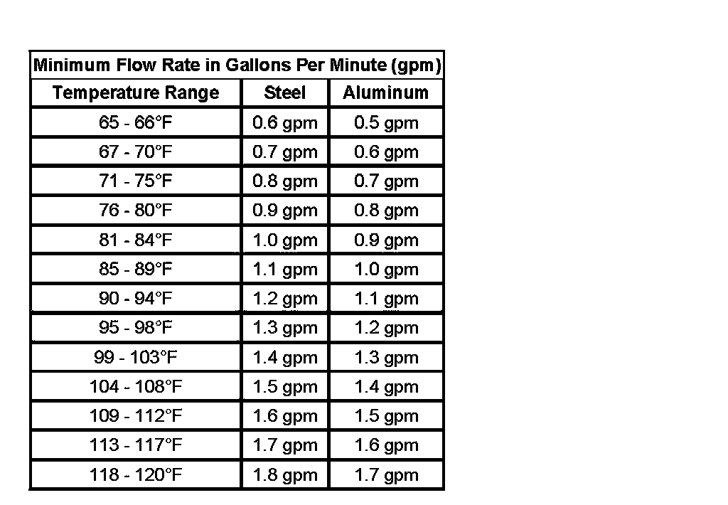 3. Refer to the table below. Using the temperature from step 1, locate on either the Steel MINIMUM Flow Rate table or the Aluminum MINIMUM Flow Rate table the minimum flow rate in gallons per minutes (GPM). Record the minimum flow rate in GPMs and the supply fluid temperature for further reference.