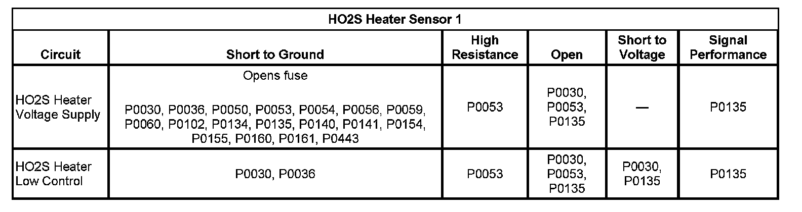 Heated oxygen sensors (HO2S) are used for fuel control and post catalyst monitoring. Each HO2S compares the oxygen content of the surrounding air with the oxygen content in the exhaust stream. The HO2S must reach operating temperature to provide an accurate voltage signal. A heating element inside the HO2S minimizes the time required for the sensor to reach operating temperature. Voltage is provided to the heater by an ignition voltage circuit through a fuse. With the engine running, ground is provided to the heater by the HO2S heater low control circuit, through a low side driver within the engine control module (ECM). The ECM uses pulse width modulation (PWM) to control the HO2S heater operation to maintain a specific HO2S operating temperature range.