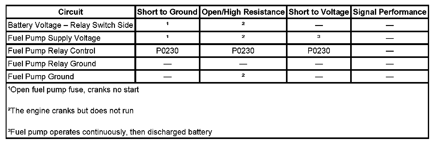 The control module monitors the voltage on the fuel pump relay control circuit. If the control module detects an incorrect voltage on the fuel pump relay control circuit, a fuel pump relay control DTC sets.