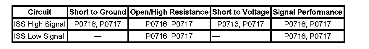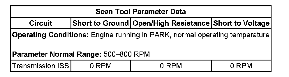 The automatic transmission input speed sensor (ISS) is a permanent magnet with a coil of wire wound around. The ISS mounts in the case cover facing the reluctor wheel of the input shaft. As the reluctor wheel is driven by the turbine shaft, an AC signal is induced in the input speed sensor. Higher vehicle speeds induce a higher frequency and voltage at the sensor. There is a fixed air gap between the sensor and the teeth on the sensor reluctor wheel. The ISS input is used by the transmission control module (TCM) in order to control line pressure, torque converter clutch (TCC) apply and release, and transmission shift patterns. This sensor is also used to calculate the appropriate gear ratios and TCC slippage. This diagnostic indicates stuck, erratic, or intermittent conditions in the system.