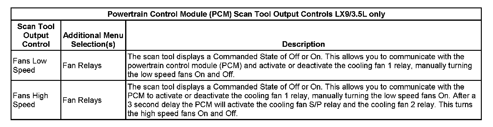 Powertrain Control Module (PCM) Scan Tool Output Controls LX9/3.5L Only: