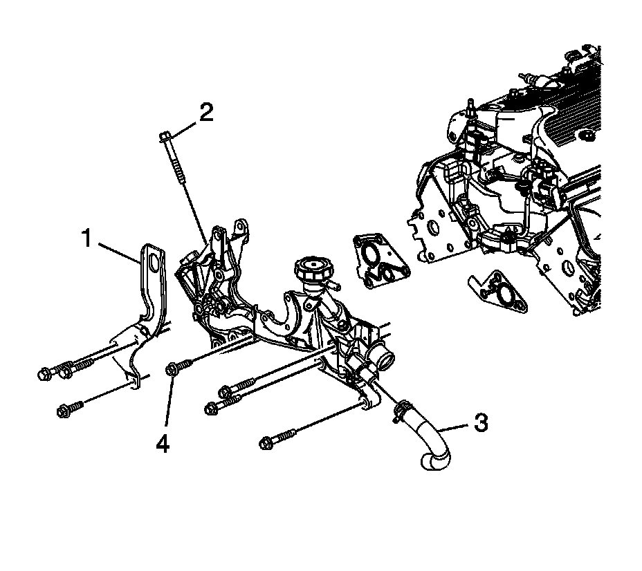 2. Install the engine lift bracket (1) and the front coolant crossover pipe bolts (4).