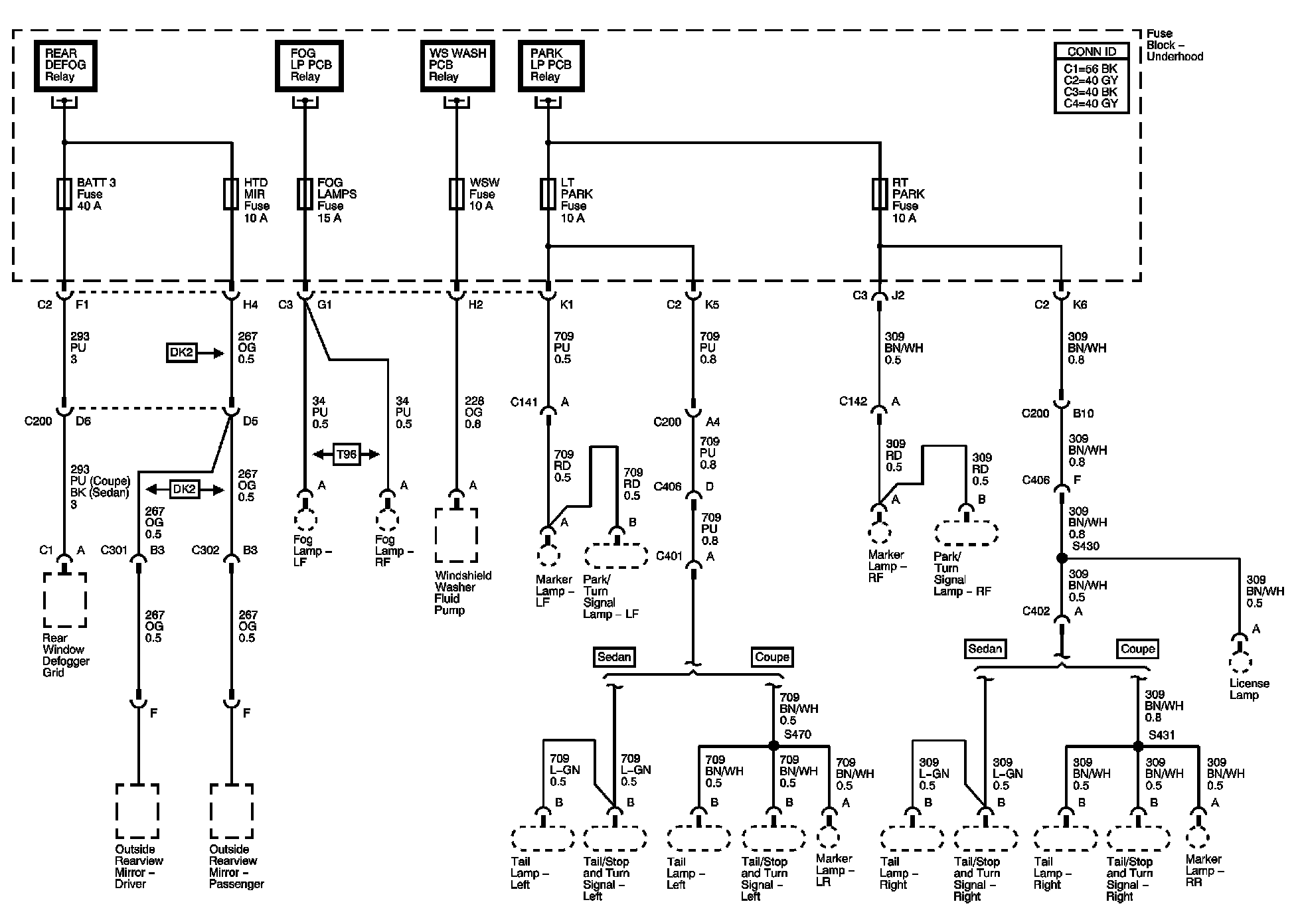BATT 3, HTD MIR, FOG LAMPS, WSW, LT PARK, and RT PARK Fuses