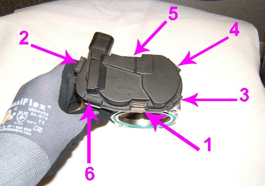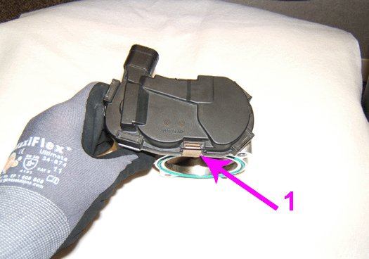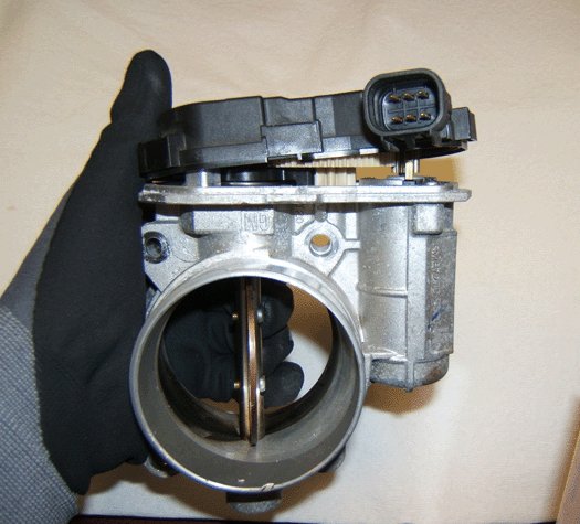 7. Hold the throttle body with your hand, so that the throttle position (TP) sensor cover is facing upward as shown.