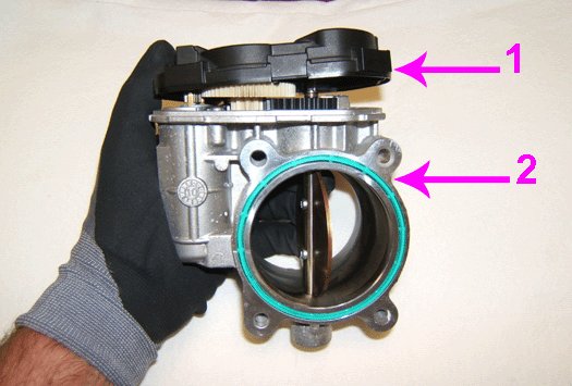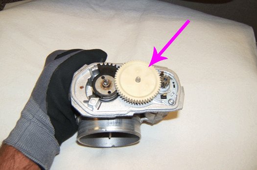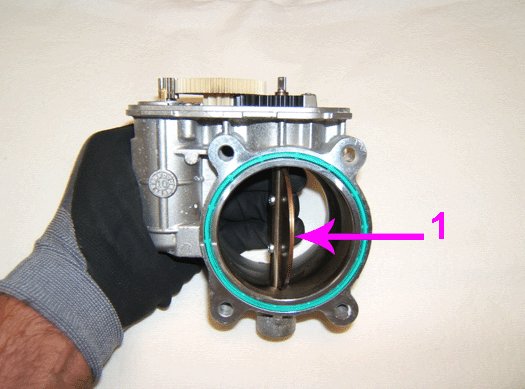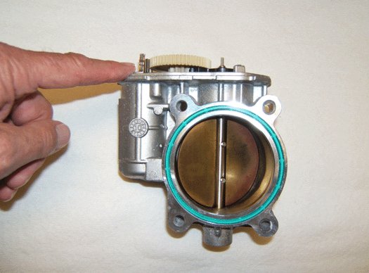 11. Maintain the throttle body in an upward position. Use your thumb to maintain contact with the intermediate gear. Place the throttle body on the workbench. => If the intermediate gear falls out and impacts a hard workbench surface or the floor, abort this procedure and REPLACE with a new throttle body assembly.