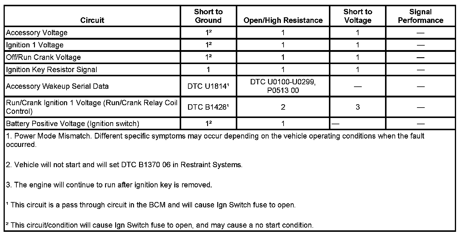 Some system functions may operate one time and not the next with a specific fault in the ignition switch circuits depending on the vehicle operating conditions when the fault occurred. Some examples are as follows: