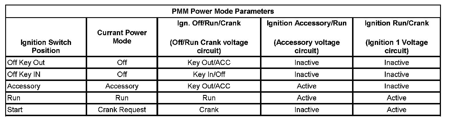 This vehicles power mode master (PMM) is the body control module (BCM). The ignition switch is a low current switch with multiple discrete ignition switch signals to the PMM for determination of the power mode. The PMM receives the ignition switch signals, and additionally a reference voltage signal from the BCM, through the ignition switch, and back to the BCM. There are redundancies within the PMM system that can allow operation of certain subsystems when there are faults in the ignition switch circuits. Other information such as serial data input from other modules and DTCs is also used to determine what power mode signals and information is transmitted by the PMM. The BCM logic uses all this information to identify the operators desired power mode and activate specific discrete signals, and serial data messages for the operation of many different subsystems as necessary. Other modules which have switched voltage inputs may operate in a default mode if the PMM serial data message does not match what the individual module can see from its own connections.