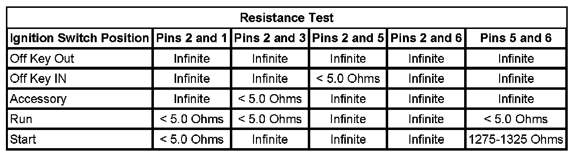 Using the Resistance Test below, check the resistance between the pins of the ignition switch listed in each switch position listed.