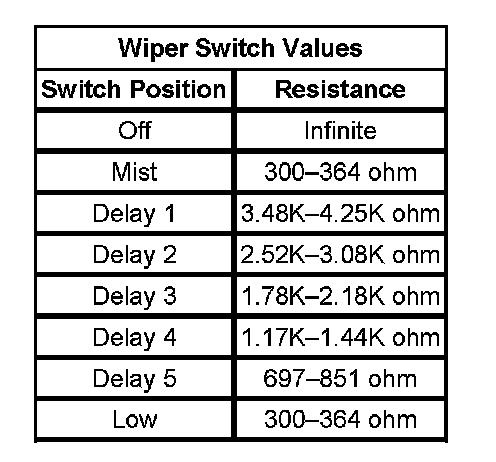 2. Test the resistance between terminals H and L. Rotate the wiper switch and compare the resistance readings to the values in the Windshield Wiper Switch Values table below for MIST, each DELAY and LOW speed.