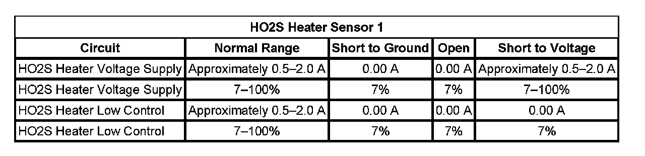 * The HO2S heater current is less than 0.31 amp or more than 1.5 amps for more than 8 seconds, twice within a 1-minute test period.