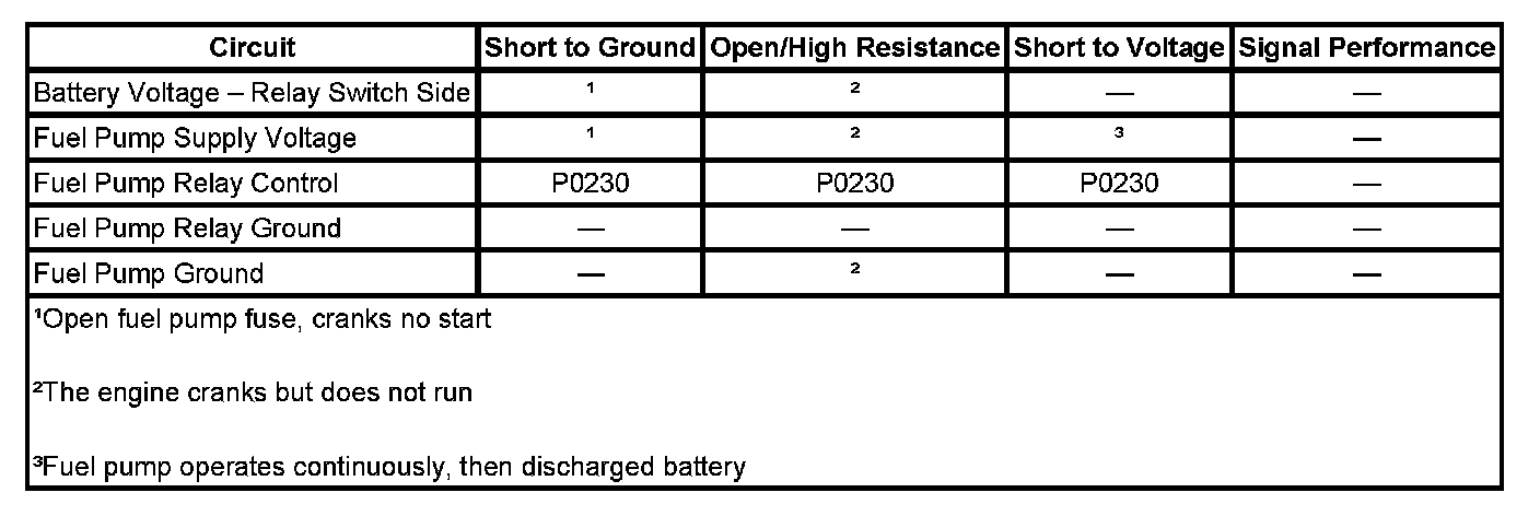 The control module monitors the voltage on the fuel pump relay control circuit. If the control module detects an incorrect voltage on the fuel pump relay control circuit, a fuel pump relay control DTC sets.