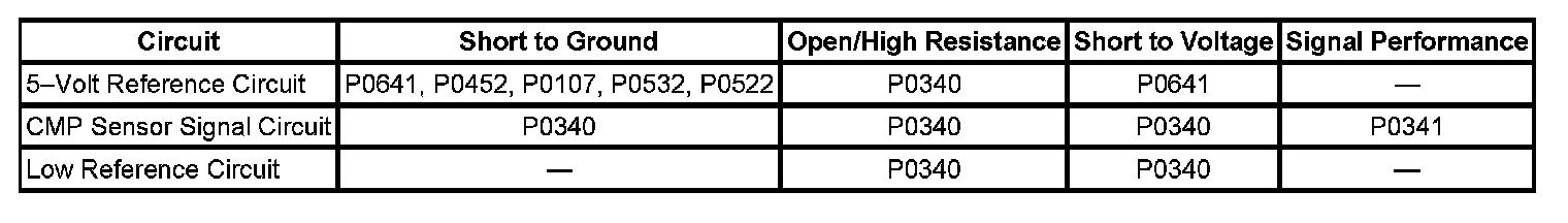 * The ECM detects that the starter is commanded on and the engine has been cranking for more than 4 seconds without a CMP sensor pulse.