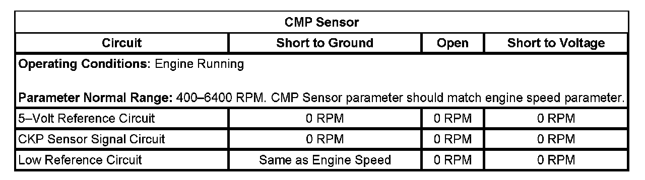 2. With the engine running, observe the CMP Sensor parameter using the scan tool. Operate the engine from idle up to 3,000 RPM. The CMP Sensor speed should match the Engine Speed parameter within 100 RPM.
