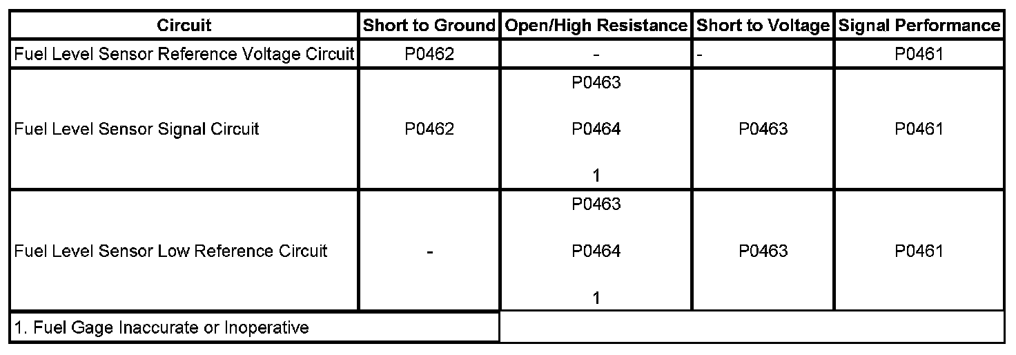 The fuel level sensor changes resistance in response to the fuel level. The engine control module (ECM) monitors the signal circuit of the fuel level sensor in order to determine the fuel level. When the fuel tank is full, the sensor resistance is low and the ECM senses a low signal voltage. When the fuel tank is empty, the sensor resistance is high and the ECM senses a high signal voltage. The ECM uses the signal circuit of the fuel level sensor in order to calculate the percentage of remaining fuel in the tank. The ECM sends the fuel level percentage via GMLAN serial data circuit to the instrument cluster in order to control the fuel gage. The fuel information is also used for evaporative emission (EVAP) and other OBD diagnostics diagnostics.