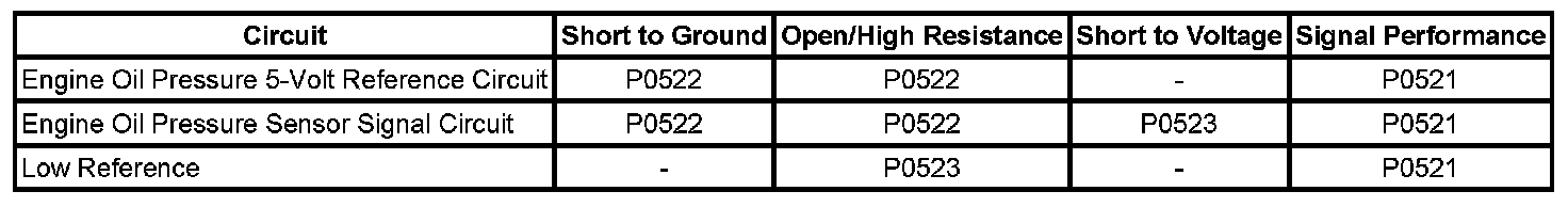 The engine oil pressure (EOP) sensor changes voltage based on the engine oil pressure. The EOP sensor is a 3-wire sensor comprising of the signal circuit, the low reference circuit and the 5-volt reference circuit. The engine control module (ECM) supplies 5-volts to the EOP sensor via the 5-volt reference circuit and provides ground via the EOP low reference circuit. The ECM monitors the signal circuit of the EOP sensor to determine if the engine oil pressure sensor voltage is within the normal operating range of approximately 1-4 volts. When the engine oil pressure is high, the EOP sensor voltage is high and the ECM senses a high signal voltage. When the engine oil pressure is low, the EOP sensor voltage is low and the ECM senses a low signal voltage. The ECM sends the EOP information to the instrument panel cluster (IPC) via GMLAN serial data message.